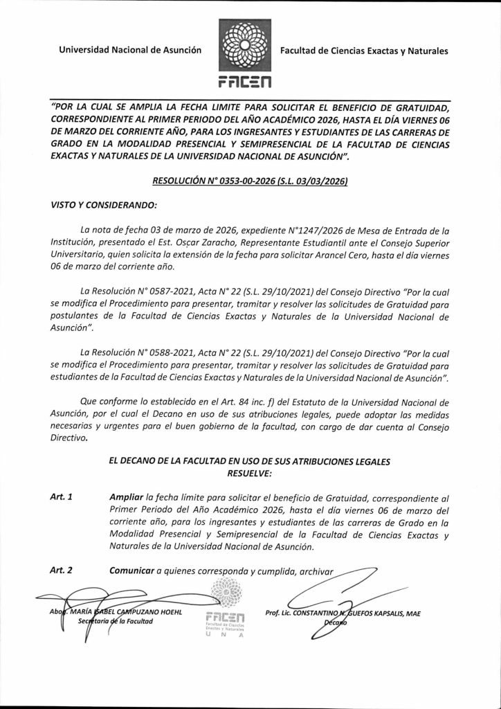 Se amplía la fecha límite para solicitar el beneficio de gratuidad, correspondiente al primer periodo del año académico 2026, hasta el día viernes 06 de marzo del corriente año, para los ingresantes y estudiantes de las carreras de grado en la modalidad presencial y semipresencial de la Facultad de Ciencias Exactas y Naturales de la Universidad Nacional de Asunción.
